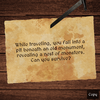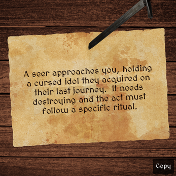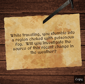 Quest Board is an intuitive quest generator app. Click anywhere on the screen to find a new quest. Once you're happy with it, click the copy button to copy the quest description to your clipboard. From there, you can paste it into your personal document or prompt up a new quest.